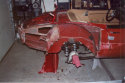 E-Type collision repair; rear quarter skin being removed.